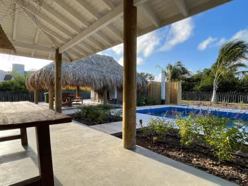 Op dit, omheind door een cactushaag, kavel van 1076m2 is deze woonvilla gebouwd voor onze Nederlandse opdrachtgever. Voor aan het terrein is de haag onderbroken voor een elektrische poort waar men met de auto het terrein op kan. Op een eiland waar de temperaturen altijd aangenaam zijn, leeft men uiteraard voornamelijk buiten. Met die reden is deze woning gebouwd met weinig binnenruimte. De villa zelf is voorzien van twee slaapkamers, twee badkamers en een keuken. Vanuit de keuken kijk je uit op een porch en het prachtige zwembad welke is omheind door een houten vlonder. Bij het zwembad heeft men nog een “poolhouse” met toilet, buitendouche en bergingsruimte.